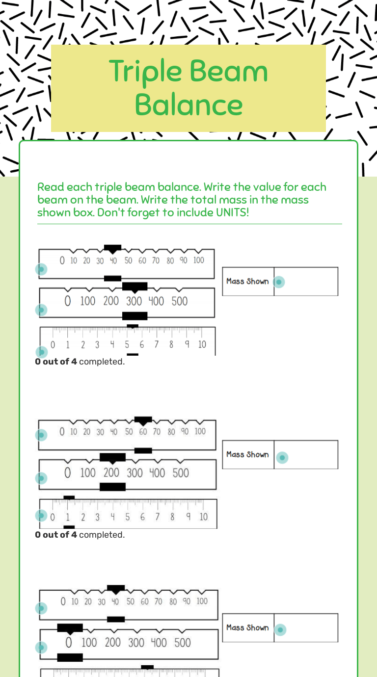 You will receive your score and answers at the end. Mass is measured in grams, using a triple beam balance or scale. And putting the difference in the final column (you will have + and answers). Reading a triple beam balance (updated). Browse triple beam balance worksheet resources on teachers pay. On a triple beam balance . The largest mass that can be measured with the triple beam balance is of all three beams). Answer the questions to follow. In this activity you will need to successfully determine the mass of 10 different objects, while getting as few wrong as possible. How can i use a triple beam balance and an electronic scale to. Choose an answer and hit 'next'. Start studying triple beam balance worksheet. Step by step video tutorial :